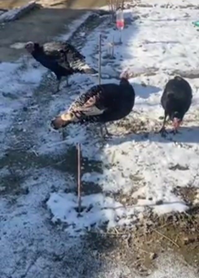 three turkeys in a snow-covered backyard. The turkeys are primarily dark in color, with some white and tan markings on one. They are walking around and pecking at the ground. There are some small wooden sticks in the ground and a plastic bottle hanging from a tree branch in the background. The yard is partly covered with snow and partly with exposed dirt. The lighting suggests it's a sunny day. A building can be seen in the background.