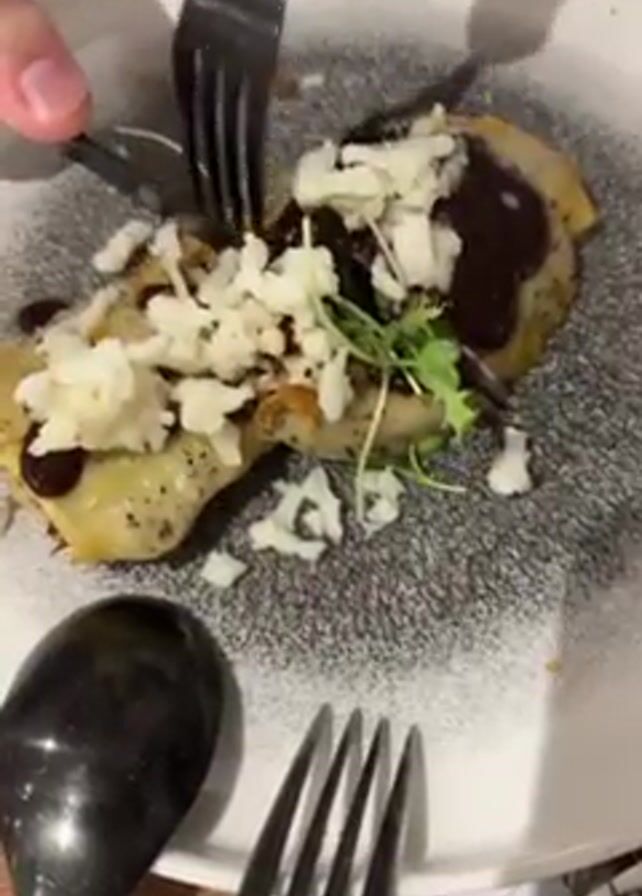 someone using a knife and fork to cut a food dish into small pieces. The plate is white with a dark gray, textured design. The food dish appears to be a rolled crepe with a dark brown sauce, topped with crumbled white cheese and sprouts. A black spoon and fork are visible on the table next to the plate.