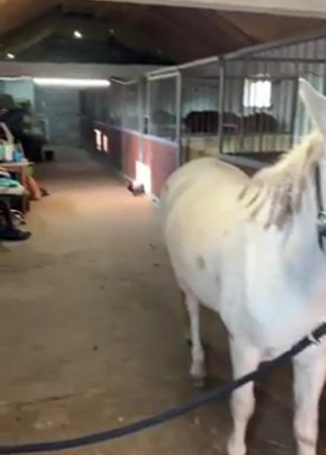 white horse standing in a stable. The horse is wearing a black halter and is attached to a lead rope. In the background, a small black and brown dog appears to be walking along the row of horse stalls, sniffing the ground. The stable is well-lit and has metal stall partitions with wooden bases.