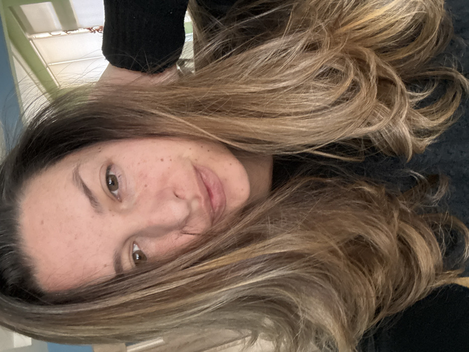 The image depicts a close-up portrait of an adult female in an indoor setting in the city of Slivnitsa, Bulgaria. The subject has fair skin with visible freckles across her face, brown eyes, and long, wavy hair primarily brown with lighter, golden-blonde highlights. Her hair frames her face and extends over her shoulders. She is wearing a dark-colored, knitted garment, possibly a sweater. Her right hand is partially visible in the upper right portion of the frame, with fingers extending towards the back of her head, somewhat obscured by her hair. The subject's gaze is directed forward, towards the camera, and her lips are slightly parted. The background is out of focus, indicating an indoor environment. A window with vertical blinds is discernible in the upper right background, admitting diffused natural light, which illuminates the right side of the subject's face. Portions of the background wall appear to be a light color, possibly light blue or green.
