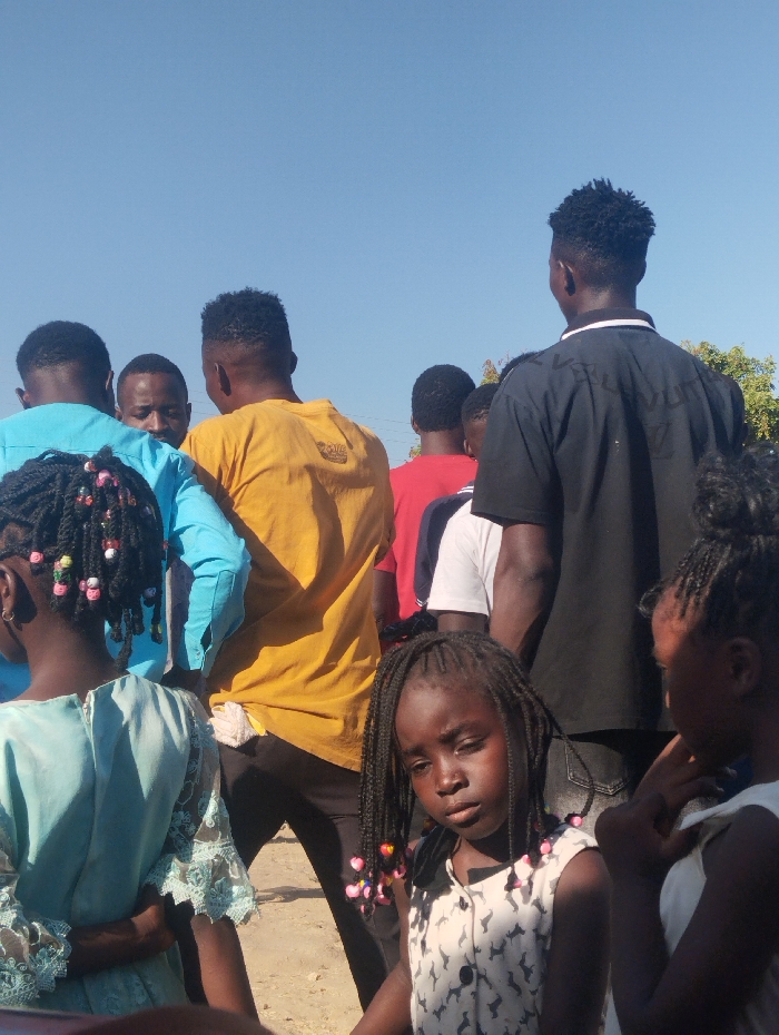The image captures an outdoor gathering of approximately ten or more individuals, including several adult males and three young girls, in an unpaved area of Idon, Nigeria