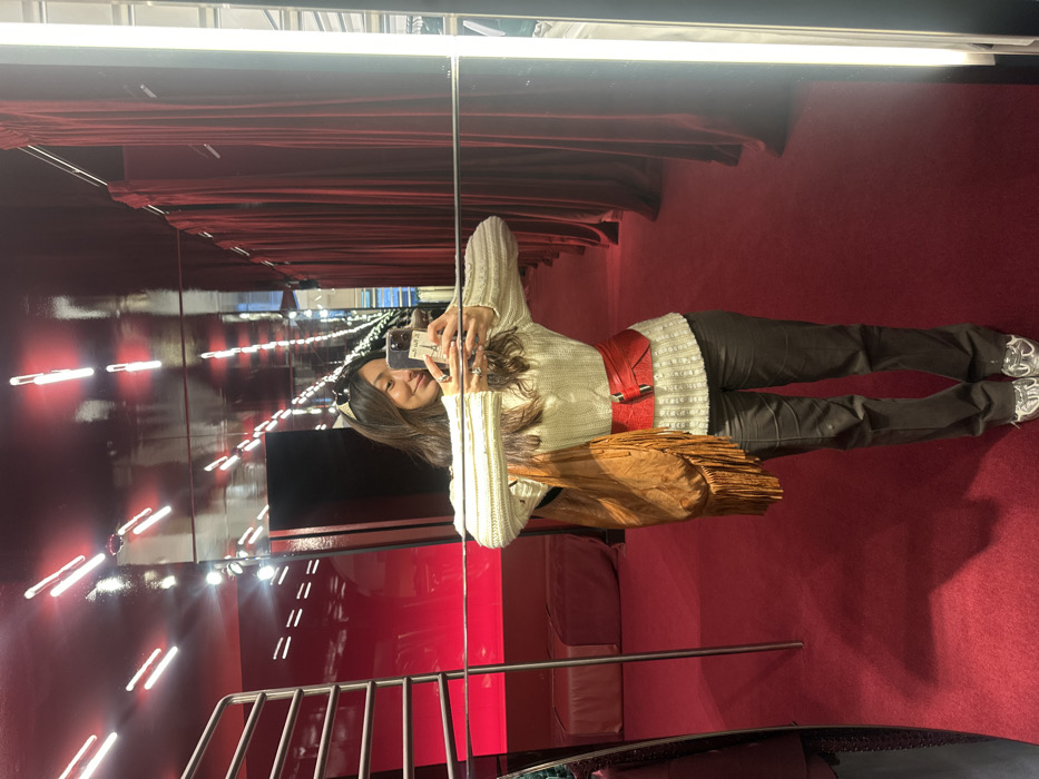 A young adult female, with long dark hair pushed back by a dark headband, smiles while taking a mirror selfie with a smartphone. She is positioned centrally, holding the phone in her right hand at chest height, with her left arm extended slightly. She wears a cream-colored, ribbed or cable-knit long-sleeved sweater, a wide red corset-style belt with a prominent gold-colored clasp, dark trousers, and metallic silver sneakers. A large, slouchy tan or brown shoulder bag with fringes hangs from her left shoulder. The phone case features an Eiffel Tower graphic. The scene is an interior retail space, specifically the Gucci boutique at Korte Gasthuisstraat 1 in Antwerp, Belgium. The floor is covered in plush deep red carpet. The walls and ceiling are highly reflective, featuring a combination of mirrored surfaces and glossy deep red panels. Multiple elongated, white linear light fixtures are visible on the ceiling and walls, creating bright reflections across the mirrored surfaces. To the left, a silver-colored metal clothing rack with horizontal bars is visible, along with a low, red upholstered bench or ottoman. To the right and in the background, a series of deep red velvet curtains, characteristic of fitting rooms or partitions, are visible. The overall environment is opulent, dominated by a luxurious red and reflective aesthetic.