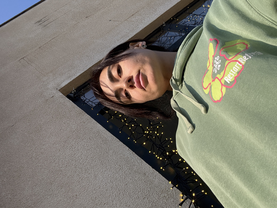 A person wearing a light green hoodie with a flower and the words "Restart Retreat" is partially visible. The person is positioned at an angle, with their face in focus. A building corner is on the left, and a dark background filled with small, yellow lights is behind the person. The sun is shining brightly, casting shadows on the building and face.
