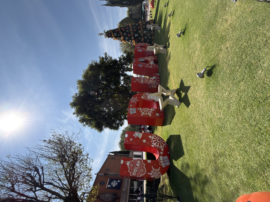 A bright sunny day highlights a festive outdoor display. Large red letters spelling "UDLA" adorned with white snowflakes and gift patterns stand on green grass. A decorated Christmas tree is visible in the background. Several metallic, watering-can-shaped decorations are scattered on the lawn. Trees, a building, and parked cars can be seen in the surrounding area.
