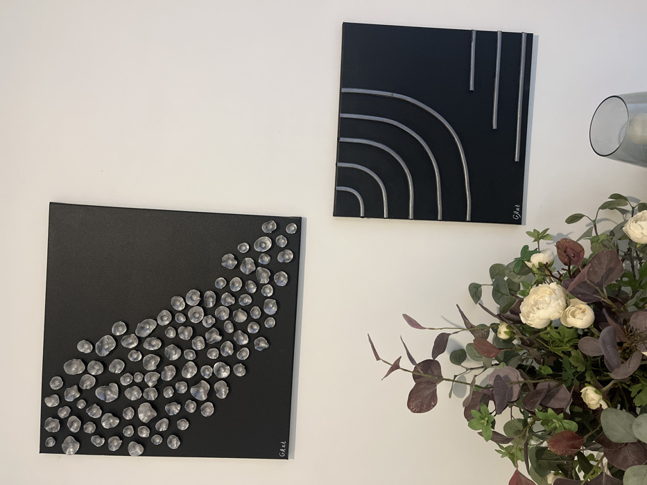 The scene depicts an interior view located in Dos Hermanas, Spain, featuring two art canvases mounted on a white wall, with a floral arrangement and a glass object partially visible in the foreground. The larger canvas, positioned in the upper-left, is square and black, adorned with numerous irregularly shaped, silver-toned, convex objects arranged in a diagonal formation from the upper-left to the lower-right. A white signature, "G. Nat", is present in the bottom-left corner of this canvas. The smaller canvas, also square and black, is situated in the lower-right. It displays silver-toned linear designs, including concentric arcs emanating from the upper-left corner and horizontal lines in the lower-right section. This canvas also bears the white signature "G. Nat" in its bottom-left corner. In the bottom-left foreground, a dense artificial floral arrangement is visible, comprising dark reddish-purple and green leaves, interspersed with multiple cream-to-white flowers and buds, resembling peonies or roses. The upper portion of a transparent, gray-tinted glass object is present in the bottom-right foreground. No individuals are depicted, and no specific actions or interactions are occurring.