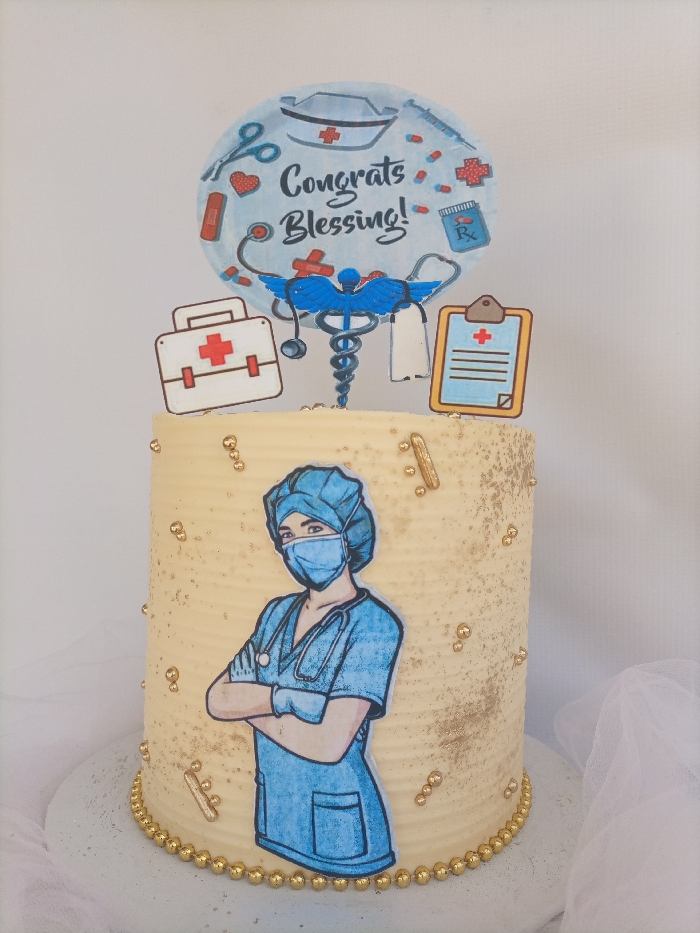 A single-tier cylindrical cake with pale yellow ridged frosting is presented against a plain white background. The cake is adorned with gold edible glitter and gold spherical and pill-shaped beads. A continuous border of small gold spherical beads encircles the base. An illustration of a female nurse, wearing blue scrubs, a blue surgical cap, a blue surgical mask, and gloves with arms crossed, is affixed to the front of the cake. Multiple medical-themed toppers are inserted into the cake's top surface: a circular light blue topper bearing the text "Congrats Blessing!" surrounded by various medical illustrations (nurse's cap, scissors, heart, bandages, pills, syringe, Rx bottle); a blue caduceus symbol; a white first aid kit with a red cross; and a brown and blue clipboard displaying a document with a red cross. The cake rests on a white or light grey cake board. A sheer white fabric is visible draped on the right side of the background. While the image itself contains no visual indicators of its geographical setting, this cake is situated in the city of Jos, Nigeria.