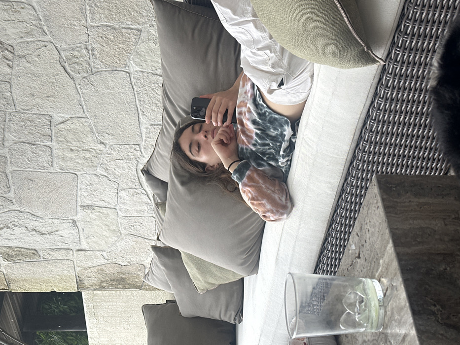The image depicts a young individual reclining on a light-colored outdoor sofa within a semi-enclosed patio area in Avandaro, Mexico