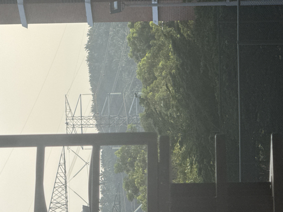 The image features a view framed by a dark wooden structure. In the distance, a series of electrical transmission towers rise against a hazy, pale sky. A dense row of trees with lush green foliage partially obscures the towers, suggesting a natural buffer zone. The overall composition is slightly tilted, adding to the sense of depth and perspective.