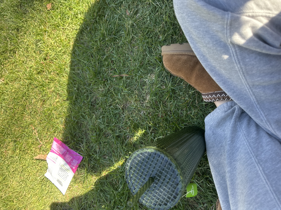 The image displays a ground-level, first-person perspective of an outdoor scene in Carlton, Australia. The lower body of an individual is visible, wearing grey sweatpants and a single brown suede-like slipper-style shoe with a decorative patterned trim. To the immediate left of the person's legs, a dark green, textured tumbler with a matching straw is positioned upright on the grass. A small green tag labeled "Pure Green Tea" is attached to the tumbler. Further left, partially obscured by a shadow, lies a crumpled white and pink plastic bag or wrapper, exhibiting visible text including the brand "HARVEST". The environment consists of well-maintained green grass, illuminated by strong sunlight which casts prominent shadows, indicating clear weather conditions.