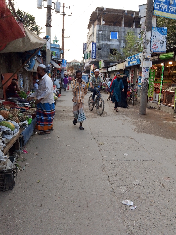 A bustling street scene shows people walking and biking along a road lined with shops. A man wearing a traditional outfit stands near a fruit stand. Another man wearing a similar outfit is seen walking. A cyclist passes them. In the background, there are more people, storefronts, and buildings, with some construction work visible.