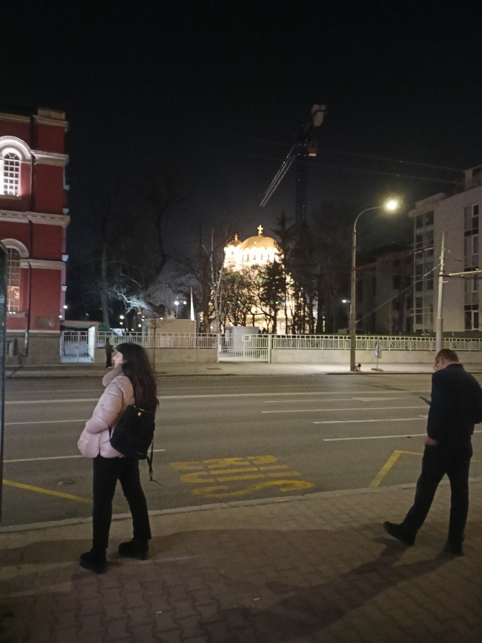 This nighttime image depicts an urban street scene in Sofia, Bulgaria, with the illuminated Sveta Nedelya Church prominently featured in the background. The scene is set at an urban intersection or street segment. On the far left, a multi-story building with a red facade and white arched windows is partially visible, one window brightly lit. To its right, separating it from the main thoroughfare, is a paved sidewalk. A young adult female stands on this sidewalk in the left mid-ground, facing slightly right with her head turned left. She has long dark hair and wears a light pink puffer jacket with a fur-lined collar, black pants, and black boots, and a black backpack. The multi-lane asphalt road occupies the center of the frame, marked with white lane lines and a yellow "BUS" stencil on the pavement, indicating a bus stop. In the background, behind a white fence and a cluster of trees, the Sveta Nedelya Church is brightly illuminated, showcasing its golden dome and crosses. Behind the church and to its right, a large dark construction crane is visible against the dark night sky. Further to the right, a streetlight illuminates the sidewalk and road, with overhead wires extending across the street. A multi-story, light-colored building with numerous windows is partially visible on the far right. On the right side of the sidewalk, a male subject walks towards the left, appearing to be an adult. He wears a dark jacket and dark pants, and is looking down at a handheld electronic device held in both hands. His right leg is extended forward in a walking stride. The sky is dark, indicating a clear night. Shadows are cast by the individuals and objects on the illuminated sidewalk.