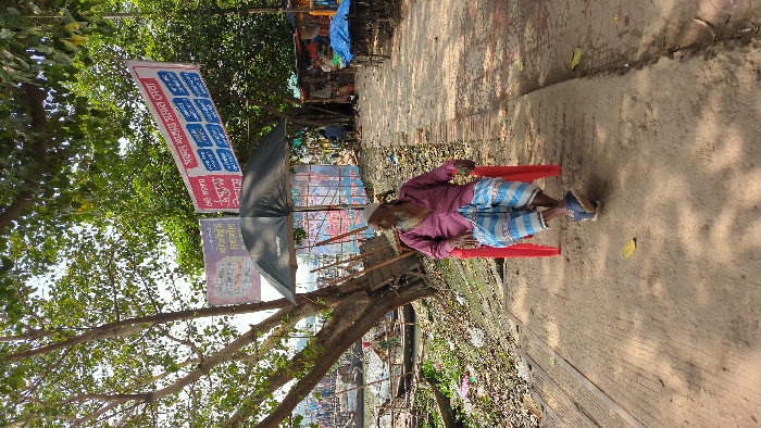 - "An elderly man with a long white beard and a white skullcap is seated on a red plastic chair under a black umbrella, located on a dirt and partially paved path in Narayanganj, Bangladesh" by FM-9iqtw2, licensed under CC BY 4.0