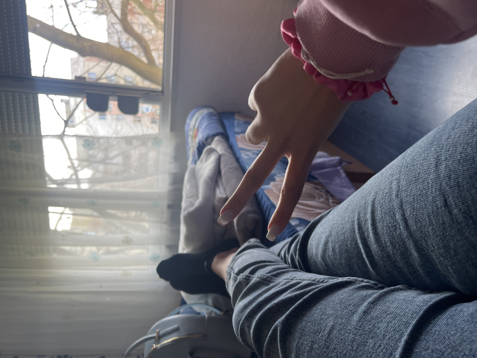 The image depicts an indoor scene in Stara Zagora, Bulgaria, focusing on the lower body and right hand of an individual. The person's legs, clad in blue denim jeans, are extended and rest on a bed. One visible foot wears a black sock. The bed is covered by a blue and white patterned duvet. Adjacent to the person's feet, a light-colored blanket is folded on the bed. To the left, a light-colored backpack with a rounded top rests on the bed. The individual's right hand, featuring white-tipped fingernails, is raised in a 'peace sign' gesture with the index and middle fingers extended. A pink scrunchie with a white drawstring is visible on the right wrist, which is partially covered by a pink sleeve. In the background, a window is visible, covered by translucent white curtains with faint blue floral patterns and white frames. Grey external roller shutters are partially open on the right side of the window. Outside, bare tree branches and a blurred multi-story residential building are discernible. The floor of the room is dark and reflective. Natural light enters the scene from the window.