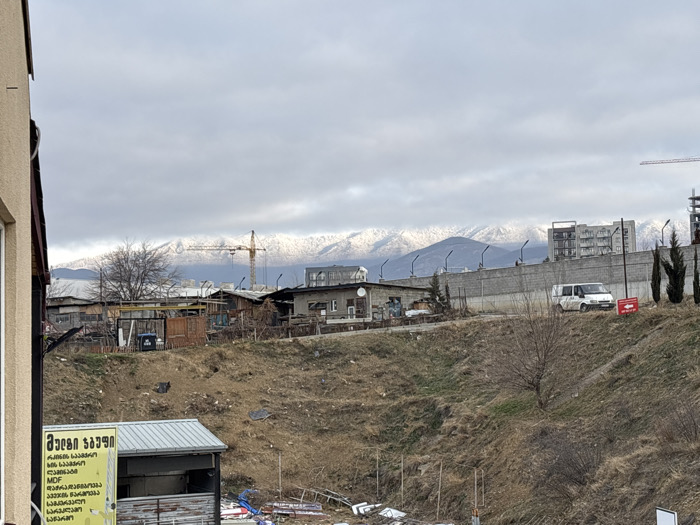 A landscape featuring a slope with sparse vegetation and litter is in the foreground. Dilapidated structures and fences are visible on the slope's upper level, along with a white van. A tall concrete wall lines part of the scene's middle ground. In the background, snow-capped mountains stretch across the horizon under an overcast sky. Construction cranes rise from the urban sprawl nestled at the mountains' base. A building is partially seen on the left-hand side of the frame.