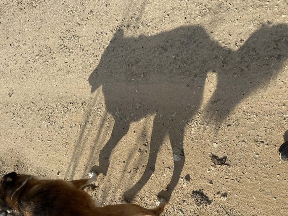 The image captures an outdoor scene on a light brown dirt and gravel path in Beit Yitzhak-Sha'ar Hefer, Israel. A medium-sized, brindle-furred dog with white leg markings is partially visible in the upper-left portion, walking forward. A human presence is indicated by a black shoe, likely a sneaker, visible at the bottom-left corner, and a prominent, elongated shadow of a person, including the torso and head (possibly wearing a hat), extending across the path to the right. The dog's shadow, also elongated, stretches behind and to the right of its physical form. Both subjects appear to be moving along the path. The ground consists of sandy soil mixed with small stones and scattered organic debris, including a dried leaf. Strong, low-angle sunlight from the left casts sharp, long shadows.