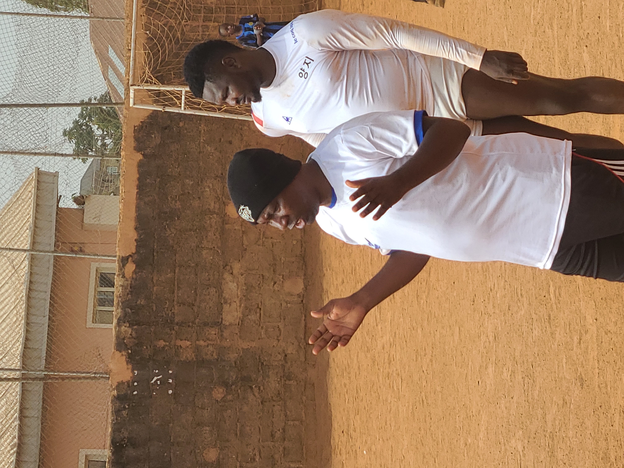 The image depicts an outdoor scene at a football field in Barakin Lerawi, Nigeria, under a light, possibly overcast sky. The ground is composed of reddish-brown dirt or sand. In the foreground, an adult male, of dark complexion, stands facing slightly right with his mouth open and both hands raised in a gesturing manner, palms open. He wears a black beanie, a white short-sleeved t-shirt with blue trim, and black athletic shorts with white and red stripes. Slightly behind him and to the right, a second adult male, also of dark complexion, stands in a long-sleeved white athletic shirt with red shoulder accents and "Le Coq Sportif" branding, along with Korean characters "양지" on the chest. He wears light-colored, possibly white, athletic shorts and has a short, dark beard and a faded haircut; he is looking towards the right. In the far background, partially obscured by a white-framed football goal with an orange net, a young boy is visible wearing a dark blue and black striped shirt. The background features a low, weathered dark brown brick wall, topped with lighter brown plaster and some white markings. Above the wall and behind a chain-link fence, a peach-colored building with windows and a light-colored, possibly corrugated roof is visible, with some green foliage beyond it.