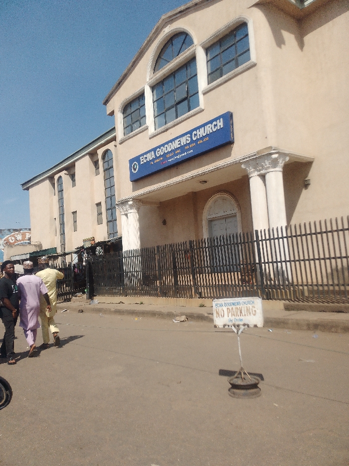 The image displays an outdoor, street-level view of the ECWA Goodnews Church, located at 13, Mangu Bello Way, P