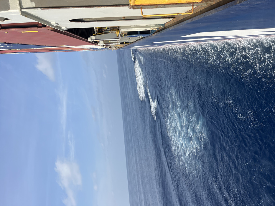 The image depicts a starboard side view from a large vessel, identified as a container ship, transiting through the open ocean
