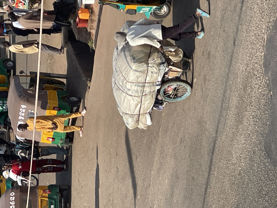 A busy street scene features pedestrians and vehicles. Several auto-rickshaws (tuk-tuks) line the roadside, their distinctive brown and green colors visible. A man pushes a heavily loaded cart, its cargo wrapped in white tarpaulin and secured with rope. He wears a white top and dark pants, while a pair of blue shoes is visible. The street is paved with asphalt, and the image is taken from a slightly elevated perspective. The scene depicts everyday life and commerce within an urban setting.