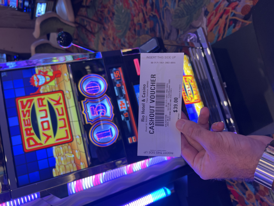 A close-up image depicts a human hand holding a cashout voucher in a casino environment