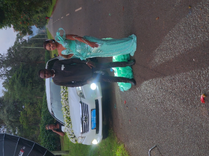 man and a woman standing in front of a white Toyota RAV4 SUV. They are both smiling. The woman is wearing a long, turquoise dress with a low neckline and a train. She has a large, elaborate headdress. The man is wearing a black, button-down shirt and black pants. They are standing on a paved road that appears to be in a residential area of New Hope, Tanzania, located at coordinates latitude: -3.275, longitude: 37.317. There are trees on either side of the road, and a lush, green lawn can be seen in the background. The SUV has a white ribbon and flowers attached to the front. There is a license plate on the car with the words "Miss Lidya". The man's shadow is projected on the pavement in front of him. The woman is looking at the camera. The man is looking off to the side of the image, while the woman is looking at the camera. There is a person in the background walking away from the camera. This appears to be a wedding-related event, and the photo may be a staged photograph of a wedding party.