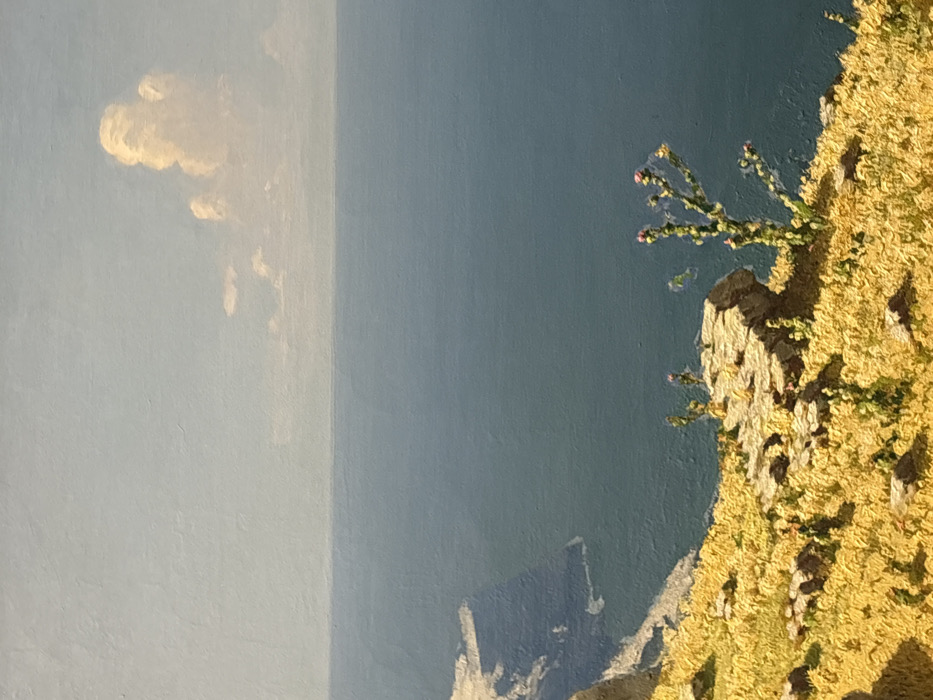 This image is a painting depicting a vast coastal landscape from an elevated perspective. The lower third of the frame shows a clifftop covered in textured, yellow-green vegetation, resembling dry grasses, interspersed with small, grey rocks and a few sparse, green plants with small pink buds. A larger, flat-topped rocky outcrop is visible in the foreground towards the center-right. The middle and upper-middle sections of the image are dominated by a wide expanse of deep blue-grey sea, stretching horizontally across the frame. On the left side, a prominent, dark grey cliff face descends steeply into the water, with a lighter-colored, eroded edge at the waterline suggesting wave action. The horizon line is sharp and runs horizontally across the upper middle of the painting. Above it, the sky is a clear, light blue, occupying the upper third of the image. A distinct, large white cumulus cloud, illuminated with a golden hue, is situated in the upper right quadrant, accompanied by a few smaller, less defined clouds to its left. No people, structures, or animals are present. The scene captures a tranquil, expansive natural environment. The depicted high coastal cliffs and deep blue sea do not correspond to the geographical features typically found in Saint Petersburg, Russia, which is characterized by flat, low-lying coastal areas along the shallow Gulf of Finland.