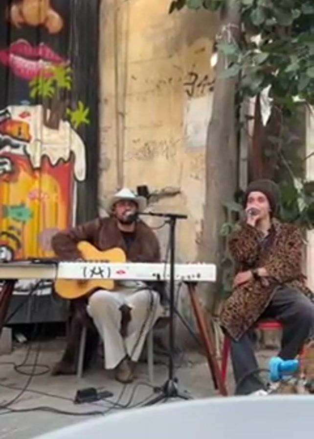 Two young men are performing music outdoors. The man on the left sits on a chair, wearing a brown fur coat, white pants, and a cowboy hat. He is singing into a microphone while playing an acoustic guitar and a keyboard. The keyboard is on a stand. The man on the right sits on a red chair, wearing a black beanie and a leopard print coat. He is singing into a microphone. They are in an alleyway with an aged wall that has graffiti. A tree is growing behind the right-side performer. Cables run along the ground. The shot is slightly obscured as if taken from a parked car.