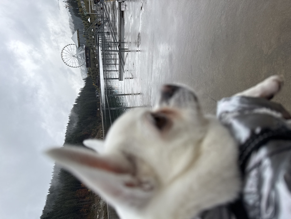 The image depicts a small, white, short-haired dog, possibly a Chihuahua, prominently featured in the blurred foreground, facing right in profile. The dog is wearing a shiny silver or grey padded harness or jacket. Its ears are erect, and its eyes are dark. In the midground, a body of water, likely a lake, extends across the frame. The surface of the water reflects the overcast sky. Adjacent to the water, in the Polianytsia area of Ukraine, is a wet concrete or paved platform or dock with several metal railings and support structures extending into and alongside the water. The wet surface reflects light, indicating damp conditions. In the background, a large Ferris wheel is prominently visible on elevated terrain beyond the lake. It features numerous white spokes and cabins. Surrounding the lake and extending into the distance are hills covered with dense evergreen forests. Patches of lighter vegetation or snow are visible on the more distant, higher elevations. The sky is uniformly overcast with thick grey clouds. The overall environment suggests a cool or cold, damp day in an alpine or sub-alpine setting, specifically at Lake Bukovel.