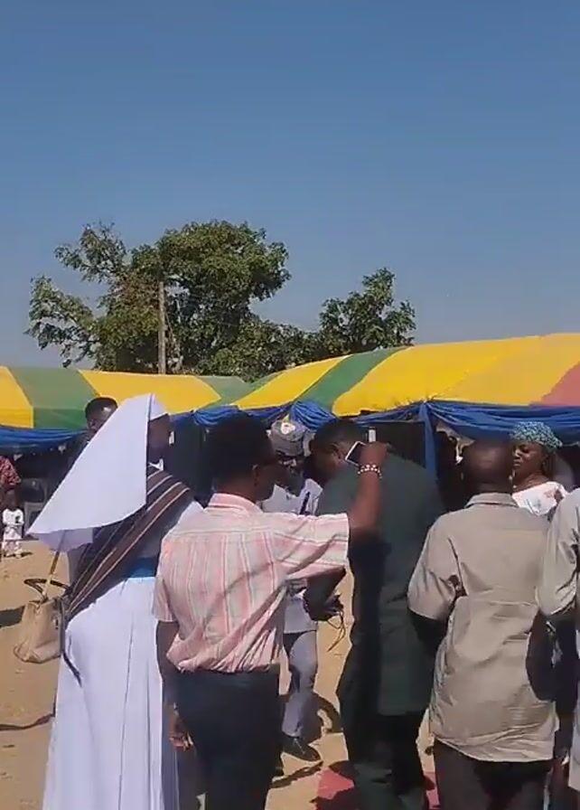 crowd of people milling about outside, under and near a large tent. The tent is striped yellow, red and blue. The crowd appears to be diverse, with people of different ages, skin colors and attire. At least one woman is wearing a nun's habit. Two flags fly on poles near the tent. The ground is dirt. The sky is clear and blue. Trees are visible in the background. There is music playing.