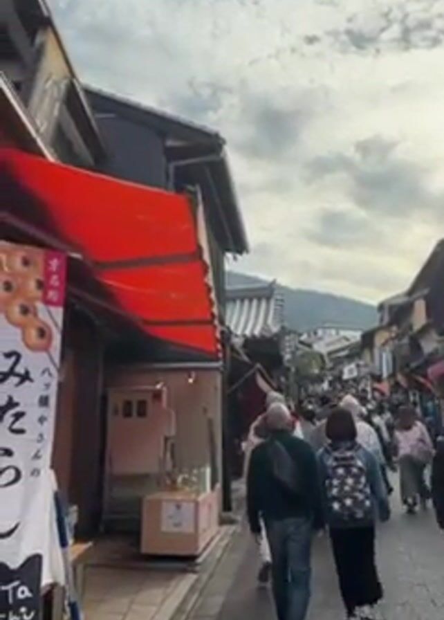 crowded street in Japan. The street is lined with traditional Japanese buildings with red awnings. There are many people walking in both directions. The sky is overcast. In the distance is a mountain. A sign for a food stall selling mitarashi dango can be seen on the left.