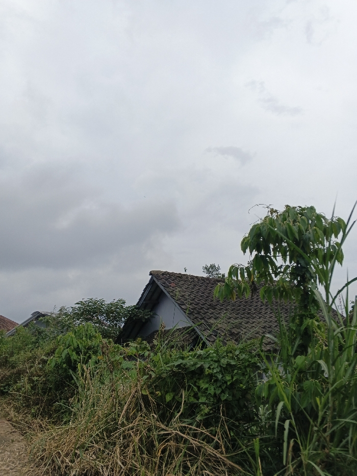 A scene in the city of Kabiufa, Papua New Guinea, is depicted under an overcast sky. The upper portion of the frame is dominated by a dense, uniform layer of grey clouds. In the middle ground, two residential structures with steep, gabled roofs are partially visible. The prominent structure in the center-right features dark, weathered roof tiles and light grey exterior walls, largely obscured by dense, varied green foliage. A second, smaller building with a similar tiled roof and a reddish-brown wall section is situated behind and to the left of the primary structure. The foreground is heavily overgrown with a mix of tall, dry grasses and lush green leafy plants, suggesting an unkempt natural environment. A segment of a dirt path or road is visible along the bottom left edge. No individuals or discernible actions are present in the scene.