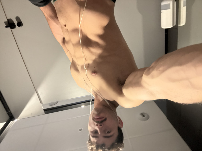 The scene depicts a shirtless male individual with a muscular physique, prominent biceps, and visible abdominal musculature, posing for a selfie in an indoor setting