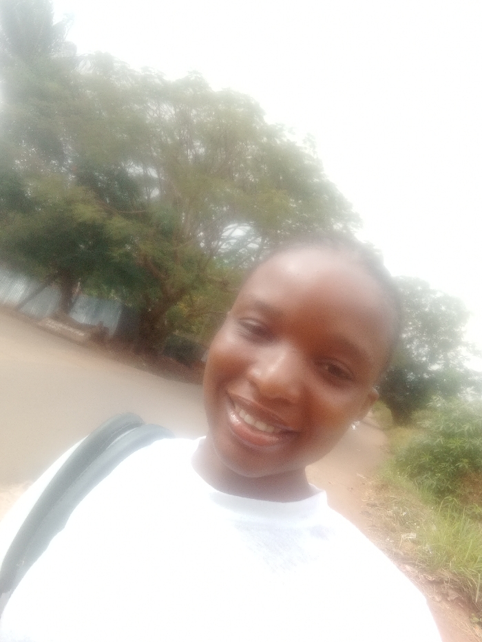 The image presents a close-up portrait of a single individual, appearing female, with dark skin and short, dark hair, positioned centrally in the frame. She is smiling broadly, showing her teeth, and looks directly at the camera. She wears a plain white, short-sleeved crew-neck t-shirt. A black strap, consistent with a backpack or shoulder bag, is visible over her left shoulder (viewer's left). Small, light-colored earrings are present on both ears. The background reveals an outdoor setting under bright, diffused daylight. Large green trees with dense foliage occupy the upper and middle sections of the background. A light-colored, possibly paved or dirt, road or path is visible behind the individual, curving slightly towards the right. On the far left, behind the trees, a section of a corrugated metal fence or structure can be discerned. Grass and smaller green vegetation line the right side of the path. The exact location in the city is Unknown, Unknown.