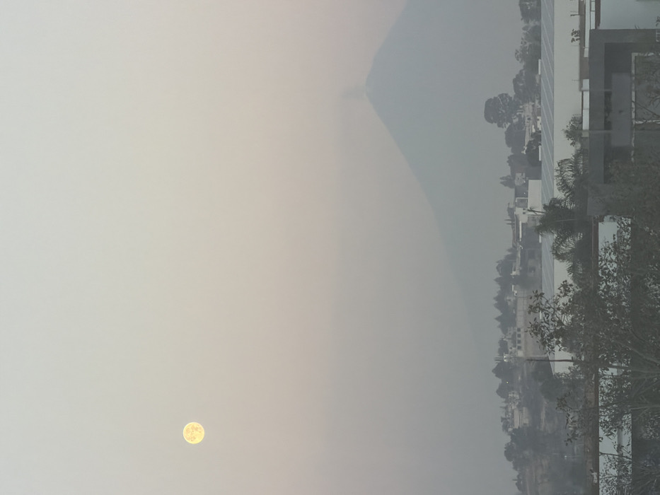 An outdoor panoramic image depicts a hazy, muted landscape from San Bernardino Tlaxcalancingo, Mexico, at an indeterminate time, likely dawn or dusk, or under conditions of atmospheric particulate matter. A bright, circular yellow-white moon is visible in the upper-left quadrant of the sky, which exhibits a pale grey-orange gradient. The mid-ground is dominated by the silhouetted form of a large, conical mountain, likely a volcano, from whose peak a faint, dark plume is observed emanating upwards. This mountain and the surrounding terrain are heavily obscured by widespread atmospheric haze. Below the mountain, a cluster of residential and urban structures, interspersed with trees and foliage, is partially visible. The immediate foreground features the upper sections of various buildings, some with flat roofs and apparent solar panel installations, along with dense tree canopies. No human figures are present in the scene.