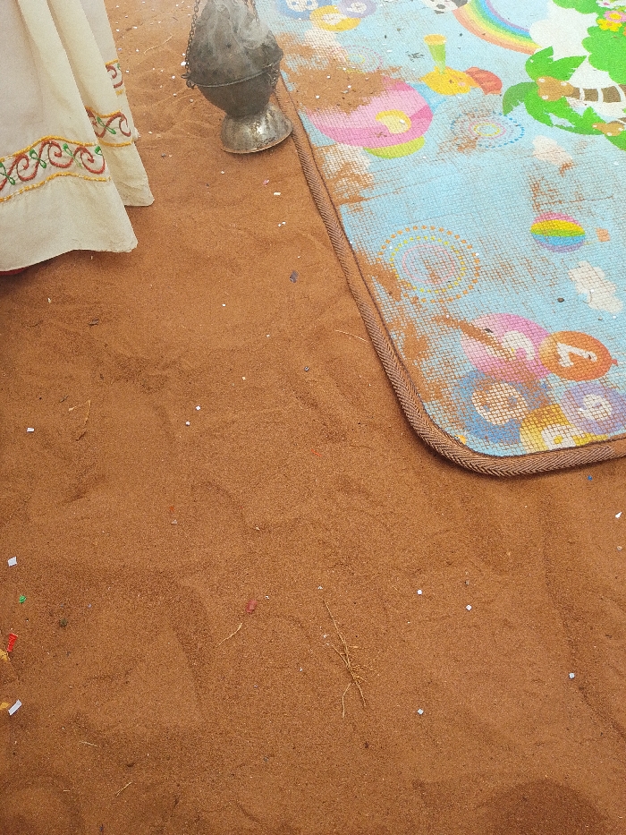 A partial view reveals a scene grounded by rust-colored sand. A corner of a light-colored garment with embroidered trim rests to the upper left, adjacent to a silver incense holder. A child's play mat, adorned with colorful cartoonish designs, lies partially visible on the upper right, its edges frayed and soiled with sand. The sand itself is scattered with small debris, adding a gritty realism to the scene.