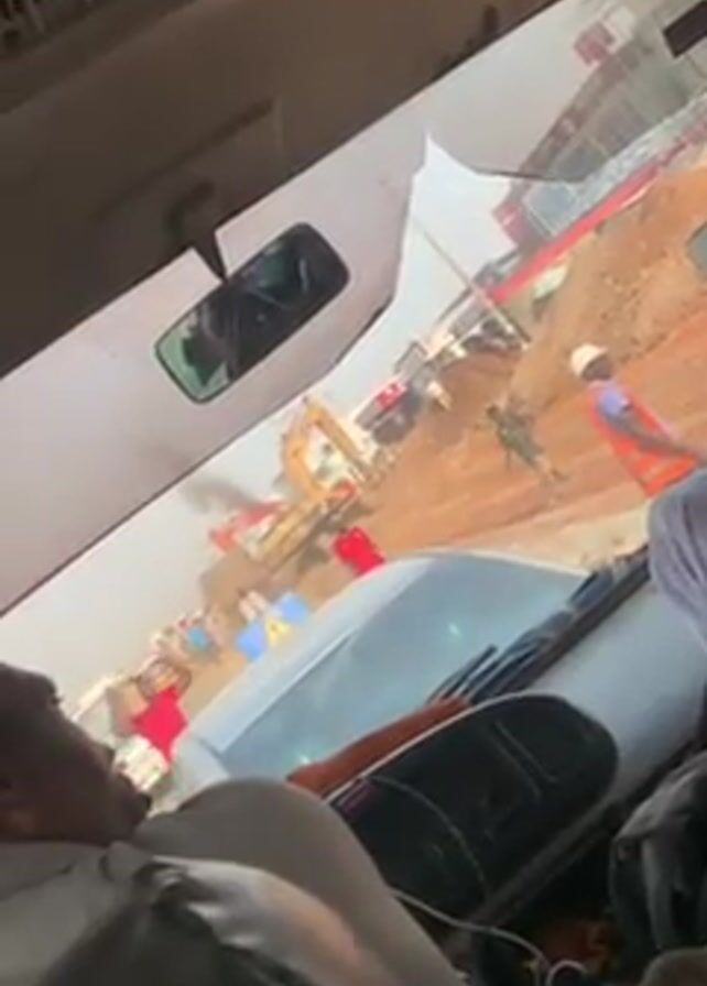 construction site viewed from inside a vehicle, possibly a bus or large van, with a driver visible in the foreground. The vehicle is in traffic, with other cars and people visible outside. The construction site includes heavy equipment, such as an excavator, and several workers, some wearing safety vests and hard hats. There is a pile of dirt or sand in the middle of the construction area. Smoke is visible coming from the excavator. The vehicle's dashboard and rearview mirror are visible, the rearview mirror appearing cracked. Passengers are visible in the vehicle. The lighting suggests it is daytime.