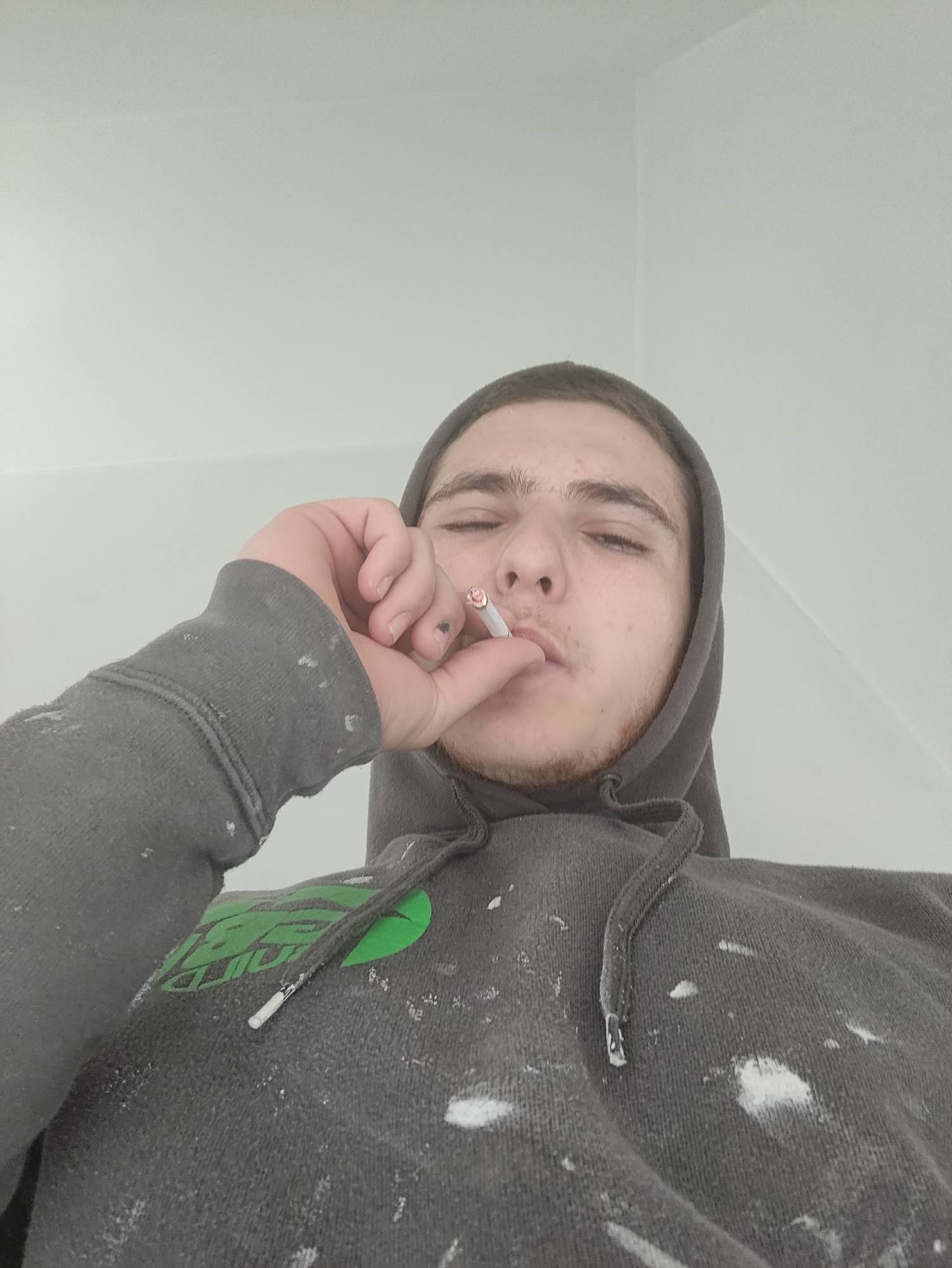 The image displays a young male subject captured from a low-angle perspective, engaged in smoking. He has short dark hair, light skin, and visible stubble on his chin and jawline. The subject is wearing a dark grey hooded sweatshirt adorned with a green logo on the left chest and numerous white paint splatters distributed across the fabric, including the sleeves and hood drawstrings. His left hand, showing a dark mark on a fingernail, holds a lit cigarette to his mouth; the cigarette's tip exhibits an orange-red glow. His eyes are partially closed. The background is an undecorated, light-colored interior wall, with a subtle corner visible in the upper right quadrant of the frame. This scene is located in the city of Deerlijk, Belgium.