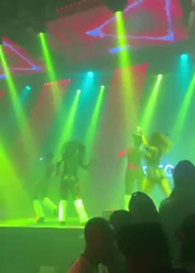 four women dancing on a stage in a nightclub, with their backs to the camera. The women are wearing shorts and tops, and some are wearing high boots. The stage is lit with green, red, and blue lights. There is a sign on the stage that says "FUEGO." In front of the stage, there are several people watching the dancers. One of the audience members holds up a cell phone to record the performance.