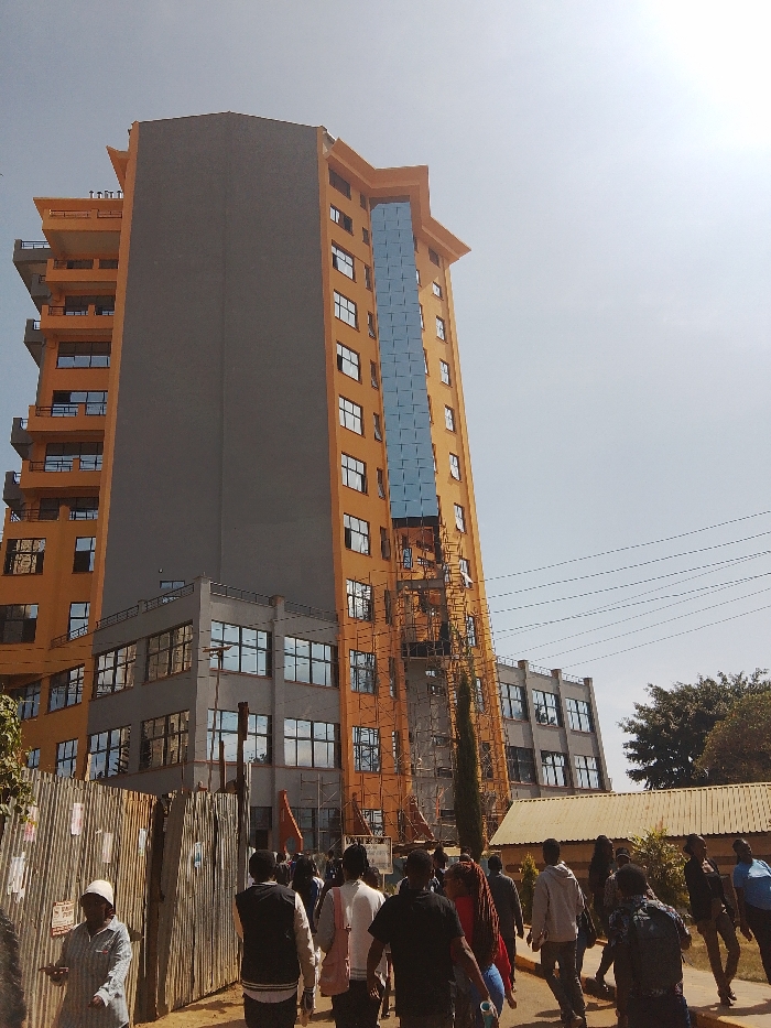 This image depicts a bustling urban scene in Karingani ward, Kenya, dominated by a tall, multi-story building under construction or renovation