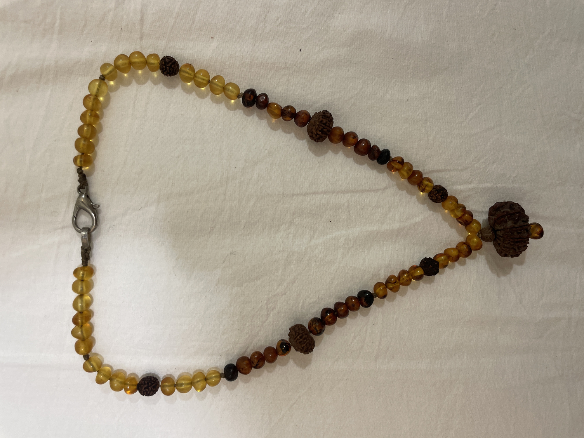 A beaded necklace is depicted lying flat on a white, textured fabric surface, forming a loose 'V' shape. The necklace measures approximately 40-50 cm in length. It is constructed from a combination of polished, irregularly shaped, translucent amber-colored beads, and smaller, opaque, dark brown or black beads, some exhibiting mottled patterns. Three smaller, rough-textured rudraksha seeds are incorporated into the upper sections of the necklace, with one larger, multi-faceted rudraksha seed serving as a central pendant at the bottom point of the 'V'. The beads are strung on a visible dark cord. A silver-toned metal lobster claw clasp is attached at the top, securing the necklace ends. The white fabric displays subtle wrinkles and texture. Diffuse lighting from above casts soft shadows beneath the necklace. No visual information is present in the image to determine a specific location within the city of Kolhapur, India. There are no people, actions, or interactions depicted.