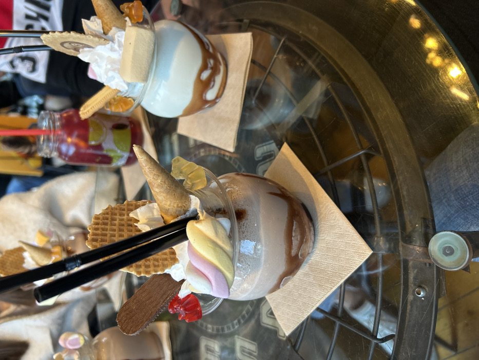- "The image depicts an indoor scene within a cafe or dessert shop in Lovech, Bulgaria, focusing on a glass-topped table displaying two elaborately garnished dessert drinks and a beverage" by FM-RT39G3, licensed under CC BY 4.0