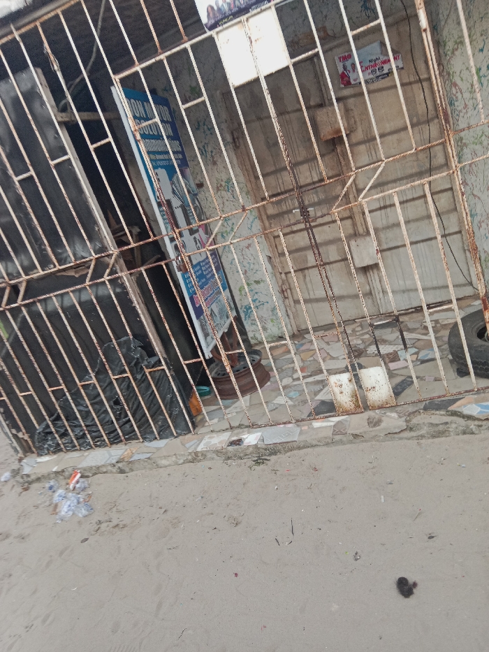 A storefront is seen through a rusty iron gate. The left side of the store is dark with a black trash bag visible. A sign with blue lettering leans against the wall. Inside, the floor is tiled and the wall is stained. A small sign advertising night entertainment hangs on the wall, and a spare tire sits on the right side of the store. The ground outside is sandy with scattered trash.