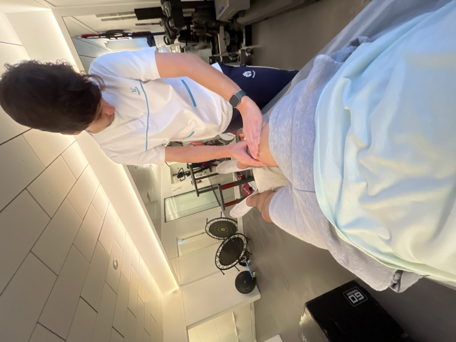 A healthcare provider wearing a white uniform with blue accents is examining a patient's leg. The patient is lying on a bed with a light blue sheet covering part of their body. The healthcare provider is using their hands to palpate or massage the patient's leg. In the background, there is gym equipment, including small trampolines. The room has white walls and mirrored surfaces.