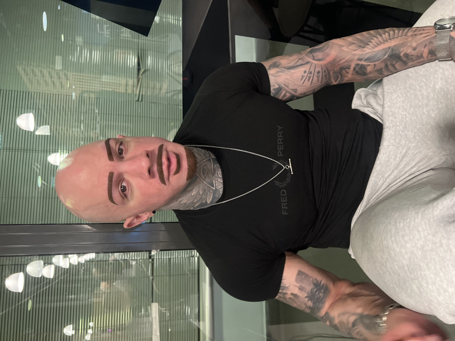 - "A bald individual with light skin, appearing to be an adult male, is seated indoors and directly faces the camera" by FM-dmGQR2, licensed under CC BY 4.0