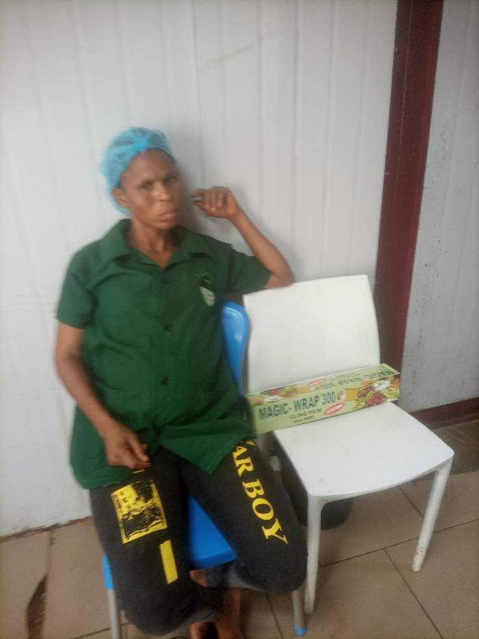 A woman in a green shirt and blue hairnet sits on a blue chair. She wears dark pants with "STAR BOY" printed in yellow on one leg. Her right hand is near her face, and she looks toward the camera. Next to her on a white chair is a box of "MAGIC-WRAP 300" cling film. A white wall with vertical lines is in the background, and a dark red support beam is visible on the right.