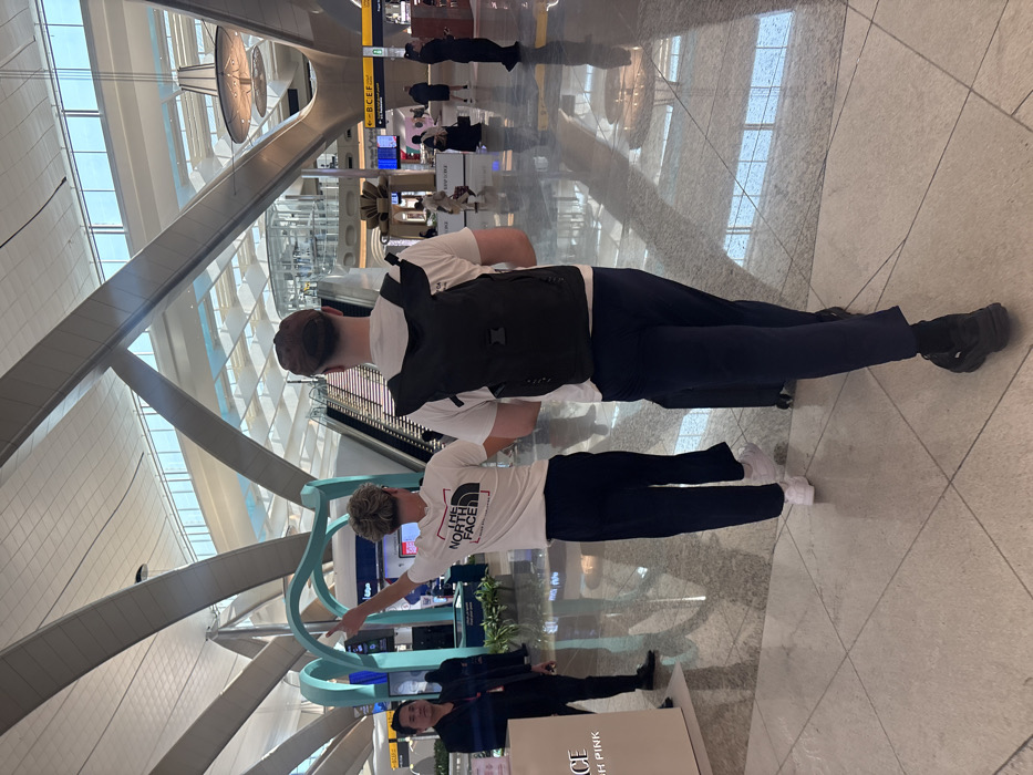 The image displays a brightly lit, expansive interior of a modern airport terminal in Al Matar, United Arab Emirates. The floor consists of large, reflective light-colored tiles, mirroring the high, geometrically paneled ceiling and the ambient light. Two males are centrally positioned in the mid-ground, walking away from the camera. The male on the left, with light-colored hair, wears a white short-sleeved t-shirt bearing 'THE NORTH FACE' logo on the back, dark trousers, and white sneakers; his left arm is raised and extended with the index finger pointing upwards and to the left. The male on the right, wearing a brown baseball cap, white short-sleeved t-shirt, dark trousers, and dark sneakers, carries a dark roll-top backpack and pulls a small, dark wheeled suitcase with his right hand. To the left of the central figures, a male in dark attire stands facing right, near a light-colored counter. In the background, an escalator ascends on the left, adjacent to teal-colored decorative architectural structures. A large, ornate circular chandelier hangs from the ceiling in the mid-right. Further in the background, digital display screens and a white directional sign indicating '← B C E F' are visible, alongside numerous blurred individuals navigating the terminal space.