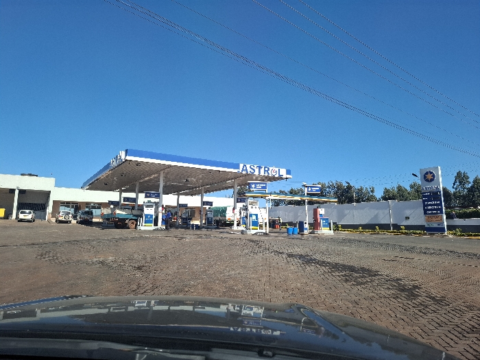 n Astral petrol station, taken from inside a car. The location is on the outskirts of Nduma, Kenya at latitude -1.172 and longitude 36.641. The station is surrounded by a white fence and has a blue and white awning. There are four gas pumps with vehicles parked at them. There is also a small building on the left side of the image, and a sign on the right side with the Astral logo. The sky is blue and clear. There are several power lines strung across the sky, and several green trees and bushes in the background.