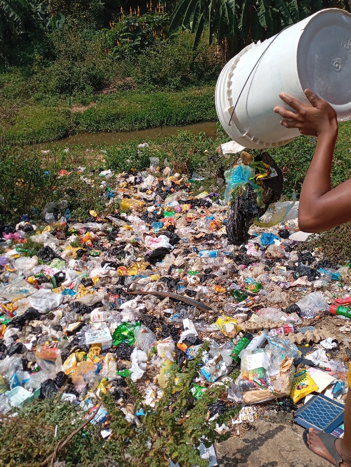 An outdoor scene in Abuja, Nigeria, features an extensive informal waste accumulation. A large, heterogeneous pile of mixed refuse, including numerous plastic bags, plastic bottles, food wrappers, and other discarded items, covers the ground in the foreground and midground. In the right midground, a person with dark skin is partially visible, holding a large white plastic bucket with both hands. The person is actively tilting the bucket, discharging additional refuse onto the existing pile. The contents being dumped include black plastic and other items. The person's bare feet are visible at the bottom right, next to a patterned rectangular object. Behind the refuse pile, a narrow stream or canal flows from left to right, bordered by dense green vegetation. Further in the background, more abundant foliage, including trees and shrubs, is visible under bright daylight conditions.