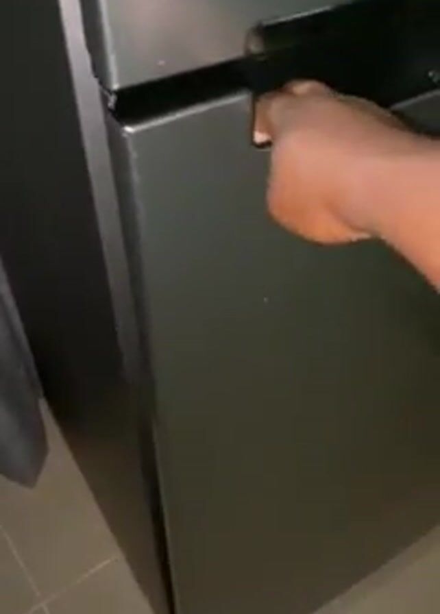 A hand opens a gray refrigerator door to reveal shelves stocked with drinks