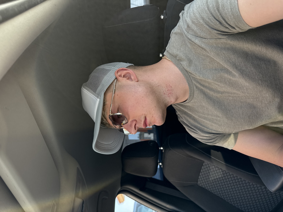A male individual is depicted seated inside a vehicle, positioned to the right of the frame, facing right in profile